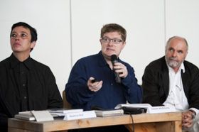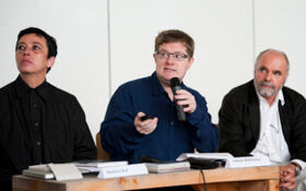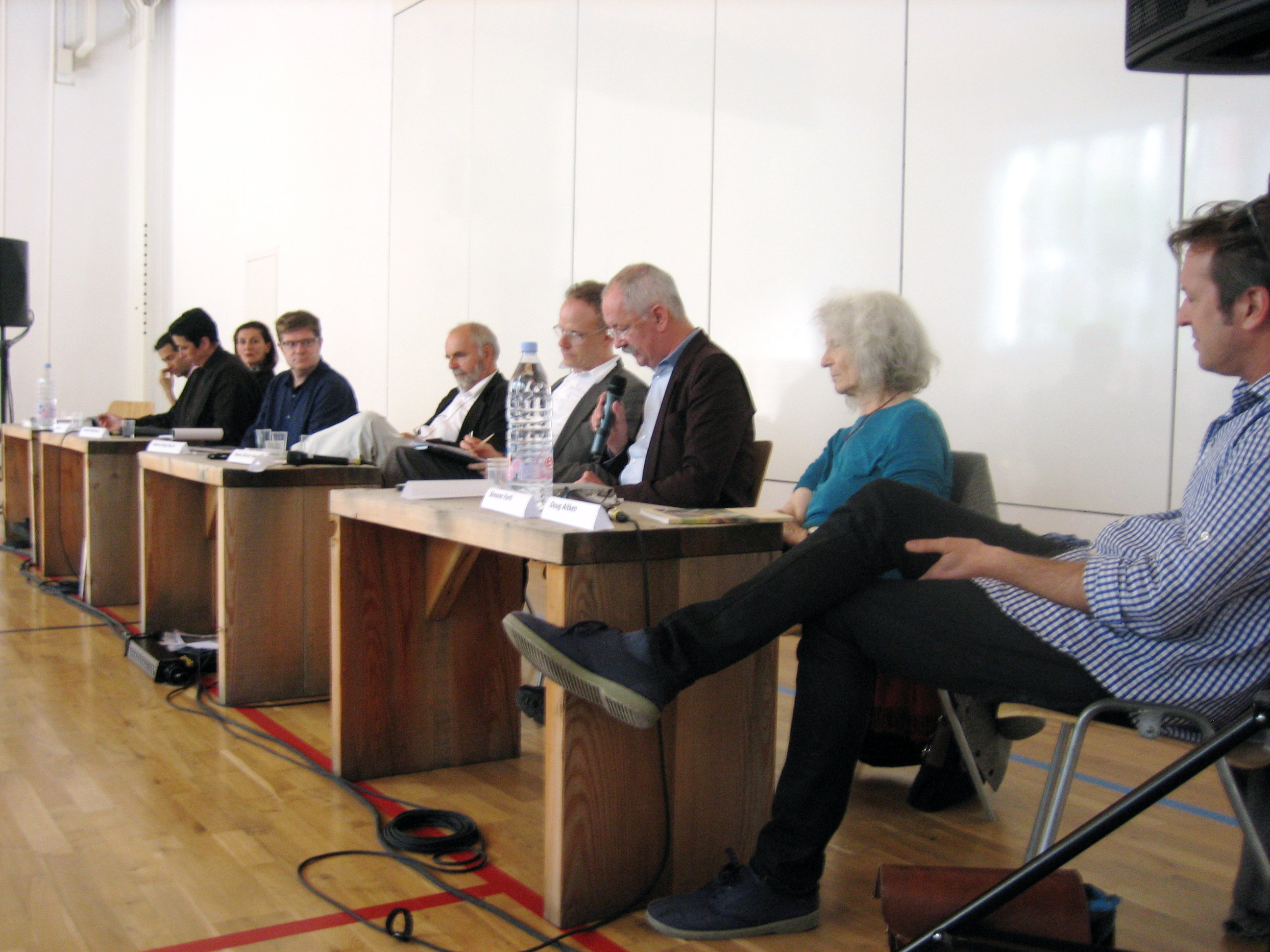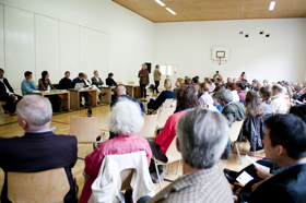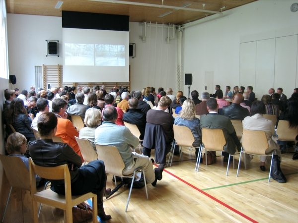 The conversations took place in the Halle am Plazzet at the civic centre in Zuoz on Saturday, 28th August 2010. Flurin Wieser, commune president of Zuoz and Cristina Bechtler, initiator of E.A.T. welcomed. In the course of a walk through a wonderful countryside, site-specific artistically works in public spaces were visited on Sunday 29th August. The weekend ended with a picnic in a nearby village. More than 100 visitors attended the forum.