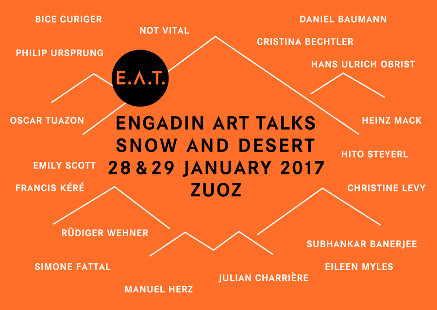 The panels were chaired by Daniel Baumann (Director of the Kunsthalle Zürich), Bice Curiger (Artistic Director Fondation Van Gogh Arles), Hans Ulrich Obrist (Artistic Director at the Serpentine Galleries in London) and Philip Ursprung (Professor gta/ETH Zürich). The audience has been welcomed by Laurence Badilatti, vice mayor of he city of Zuoz, and Cristina Bechtler, founder E.A.T..